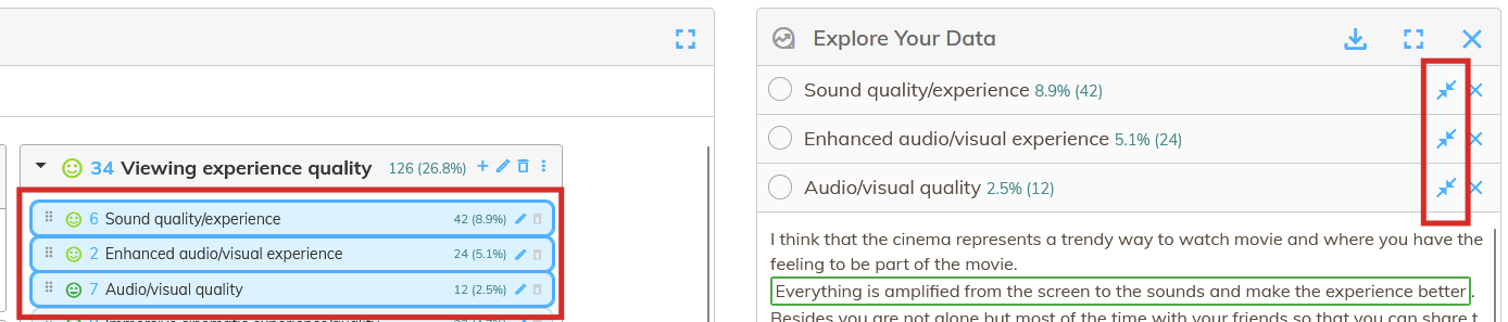 The examples of the sub-Themes can be displayed when clicking on a sub-Themes. If you want to un-merge a sub-Theme, you can drag&drop the sub_theme from the merge zone to the main Codeframe panel.