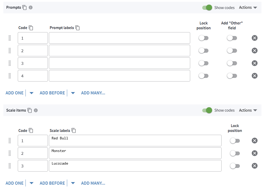 The Grid question should contain the same number of Prompts as Answers in the Text List question. These are essentially the rows where the coding for each verbatim will be stored.