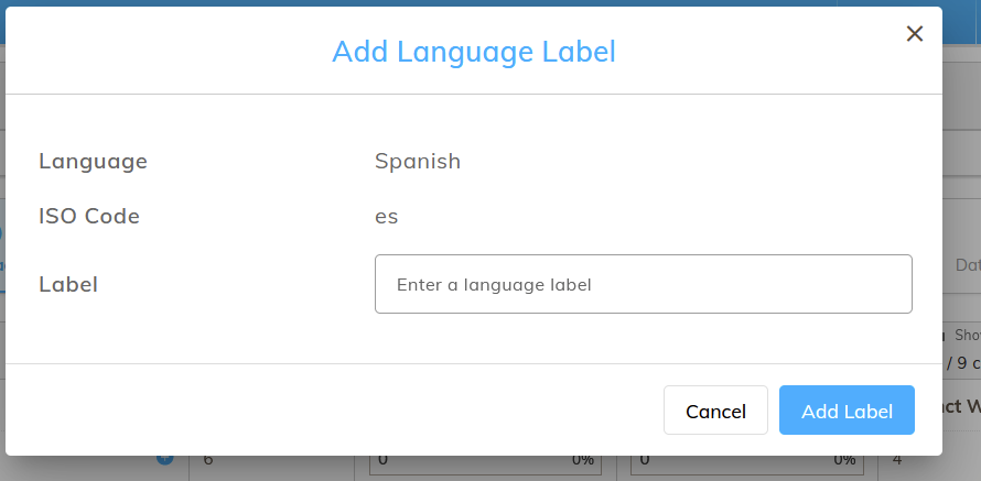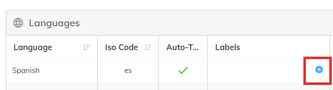 To add a Language Label, click the "+" icon in the Label column of the relevant language: